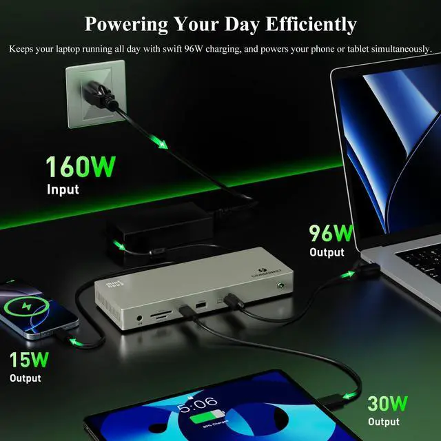 Thunderbolt 4 Compliance & 96W All-Day ChargingThis high-performance thunderbolt 4 dock (a top-tier thunderbolt docking station) supports 96W Power Deliveryenough to keep laptops charged nonstop, matching the reliability of a premium docking station with power supply. With 40Gbps ultra-fast transmission (10x faster than USB 3.0), its a must-have docking station for professionals, doubling as an efficient laptop docking station for heavy data workflows.