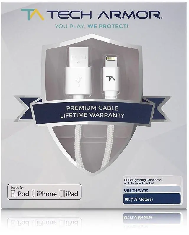 ^^ LIMITED LIFETIME WARRANTY - Trust your device to the leaders in device protection. Our warranty promises you'll be protected in case of any rare product failures. Enjoy peace of mind knowing that you have a reliable and durable lightning cable. ^^ BRAIDED LIGHTNING CABLES - Never deal with tangled cords again. Our BRAIDED NYLON lightning cable exterior provides extreme durability, anti-tangle properties, and crimp resistance for ultimate convenience and hassle-free charging. ^^ EXCEPTIONAL QUALITY - Why settle for cheap lightning cables that result in frayed wires, slow charging, and connector damage? Choose a CERTIFIED APPLE charging cable from Tech Armor for reliable performance and peace of mind.