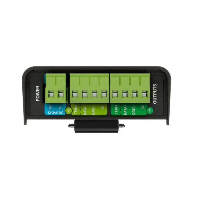 *Feature only works with DMX500K-compatible fixtures. Enjoy effortless daisy-chaining with dual Ethernet ports, one featuring Power over Ethernet (PoE). This provides a flexible and streamlined wiring solution, ideal for scalable installations. The configuration as well as the firmware updates are managed through the user-friendly localhost web interface to simplify commissioning from any computer on your network. Designed for ease, the slim, 4 DIN-module electrically insulated housing supports TS35 DIN and surface mounting, with user-friendly pluggable terminal blocks for simple wiring.