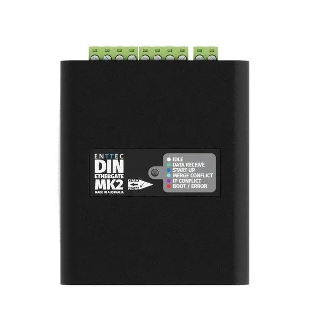 Next-generation Ethernet to DMX/RDM gateway with traditional DMX512-A compatibility, and additional Overdrive Mode for unique DMX500K support. The DIN Ethergate Mk2 is a robust and reliable installation-grade DMX node engineered to take any architectural, commercial, or entertainment project to the next level. With 2 Universes of bi-directional DMX to standard DMX512-A conversion and ArtRDM support, the DIN Ethergate Mk2 is a flexible, cost-effective method to connect physical DMX devices to your network infrastructure. Unlock enhanced performance with Overdrive Mode*; outputting at a higher data transmission rate of 500Kbps to control up to 1, 024 channels per port (4 Universes).