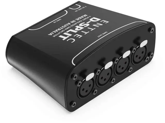 Expand Your DMX Platform The ENTTEC D-Split DMX splitter provides an excellent workaround for long DMX cable runs and device daisy chains. Ideal for everything from churches to mobile DJ rigs, the D-Split allows your controller to remain in the central location by splitting a 3- or 5-pin DMX input into four 3-pin outputs. Lightweight and portable, many Sweetwater lighting techs keep a D-Split on hand to reduce cable clutter and improve overall fixture compatibility. Each output is optically isolated, protecting your fixtures from up to 1, 000 volts of stray voltage.