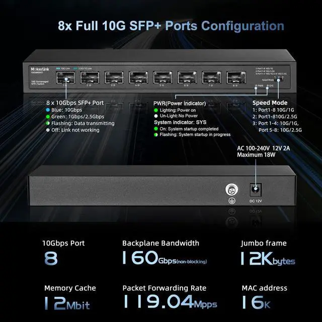 MokerLink 8 Port 10Gbps SFP+ Switch, Support 1G/ 2.5G /10G SFP Module, 160Gbps Bandwidth, Fanless Unmanaged Plug and Play Ethernet Switch