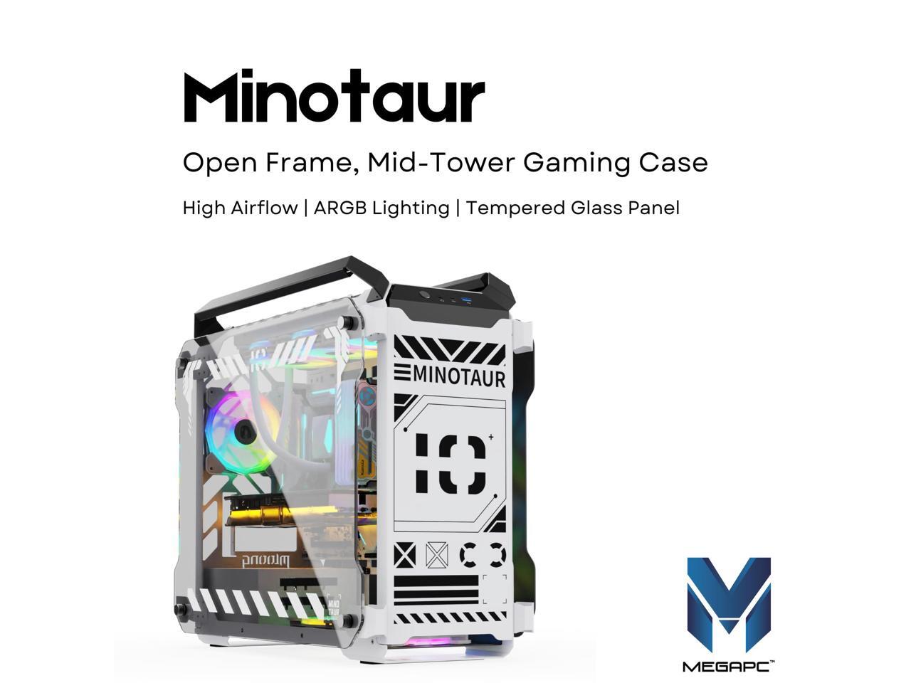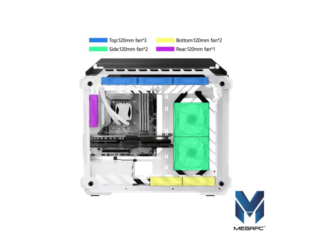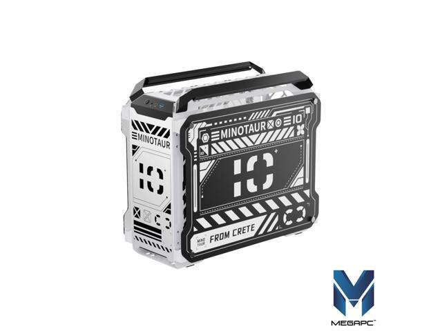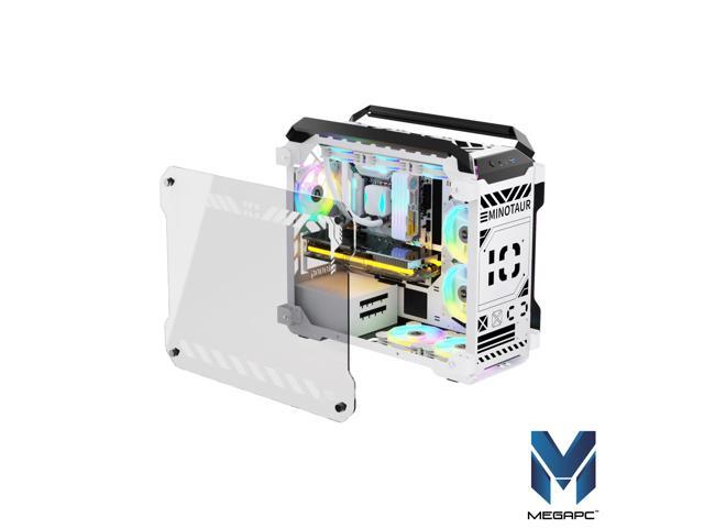 MegaPC Mino Open-Frame ATX Gaming Case - Industrial Design, Tempered Glass Panels, High Airflow, ARGB Lighting, USB-C Port (Black/White/Print Stream, with Fans + Watercooler)