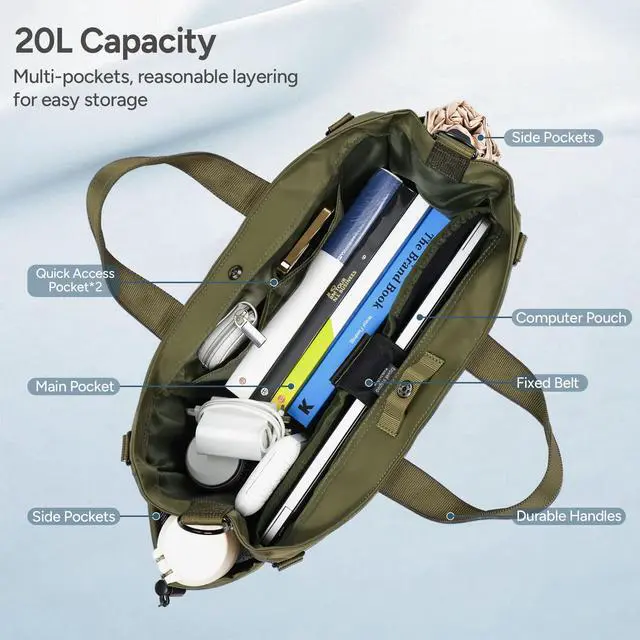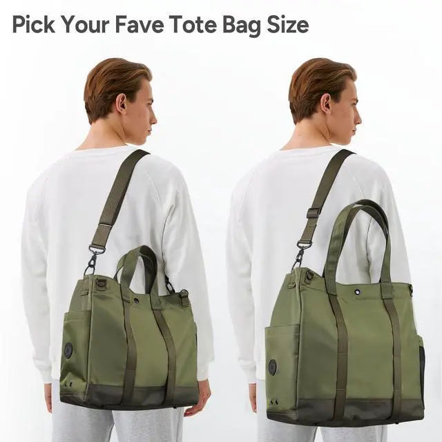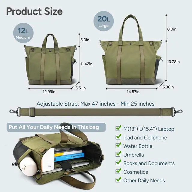 City Hike Tote Bag (L) The Travel inspira tote bag is a versatile and durable accessory for both women and men. Made from high-quality nylon and PVC, it is wrinkle-free and easy to clean. The reinforced flat bottom with four metal feet protects against scratches. The bag features a smooth zipper, sturdy metal hardware, and reinforced stitching for added durability. With ample storage, the tote bag includes a padded interior pocket for tablets and side pockets for water bottles and umbrellas. It measures 14.57 x 13.78 x 6.30 inches and can fit most 13'', 14'', 15'', and 15.6 '' laptops.