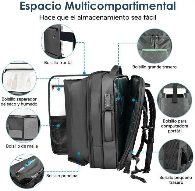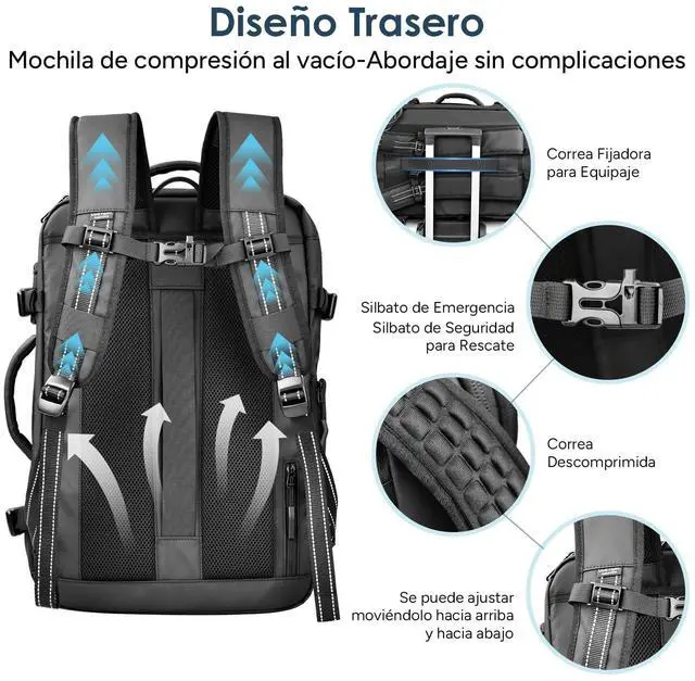 45 - 65L - Equipped with a built-in high-efficiency electric pump, this travel backpack can compress your bulky clothes and down jackets by up to 50% in minutes, freeing up immense space. Perfect for fitting everything you need for a 3-day trip or longer into one compact carry-on bag ^^ - & Designed to meet strict carry-on size requirements (50*29* 15.5 cm) for most airlines. Skip the checked baggage fees and long waits! The integrated TSA-approved lock allows security personnel to inspect your luggage without damage, keeping your valuables secure during international travel.