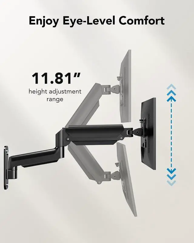 Comfortable Work by Easy Adjustment- After over 20, 000 exercise tests, The built-in gas springcore system of Huanuo single monitor arm wall mount makes the adjustment easier and more smooth. You can easily raises your monitors to eye level, which helps relieving the strain on your neck, shoulders, and back.