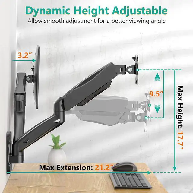 Dynamic: Our monitor arm wall mount is easily adjustable, allowing you to work in a more comfortable, ergonomically correct position to reduce neck and eye strain. Max Distance between