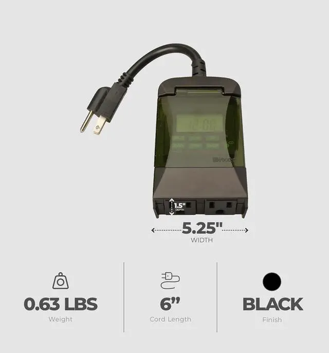Weatherproof housing with 6in cordHit the ' R' Reset button to turn the screen on after recharging the backup battery125Vac; 60Hz; 1/2Hp; 15A 1875 Resistive; 10A 1250W Tungsten; 8A Ballast