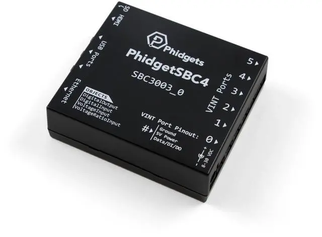 Debian GNU/Linux and Phidgets drivers pre-installed ^^ Six VINT Ports - Each port can control a VINT device, sensor, or be used as digital I/O ^^ Three USB Ports for connecting peripherals, storage devices, or USB Phidgets ^^ Connects to your network via Ethernet, or wirelessly via USB wifi adapter (sold separately) ^^ HDMI Port allows direct connection to a monitor to display the Linux terminal