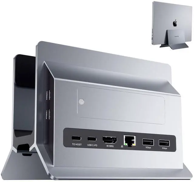 Laptop Docking Station: This laptop stand docking station for USB C laptop comes with 1 x 4K@60Hz HDMI for HD video output, 2 x USB 3.0, 2 x USB C 10Gbps, SD/ TF, RJ45 wired Gigabit Ethernet.