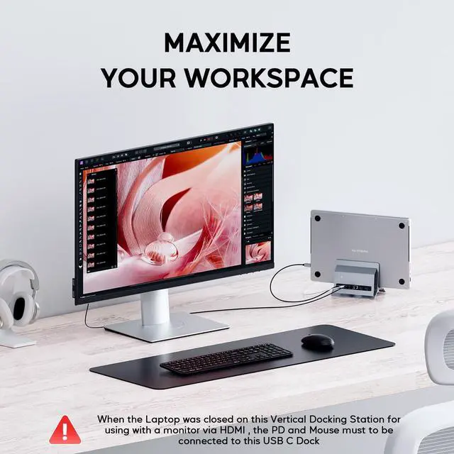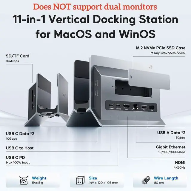 Super Speed Data Transfer Dock: This vertical docking station has 2 USB C 10Gbps port (not support video and charging) and 2 USB A 3.0 ports 5Gbps to transfer fileS. It allows you to connect mouse/keyboard without lag. The SD/Micro SD card slot is suitable for all kinds of data cards, and can transfer files quickly (480Mbps) in seconds, improving your work efficiency. With PD 100W Charge Port and RJ45 Wired Gigabit Ethernet (10/100/1000Mbps). The SD/Micro SD of this USB C Laptop Dock supports reading 2 cards simultaneously. ^^ 2 in 1 Docking Station with StandThis vertical laptop docking station not only can meet the various needs of users, but also meet the laptop stand function (improve desktop utilization). The demolished bracket is enough to act as a laptop bracket to help increase space, create more working space, and increase productivity.