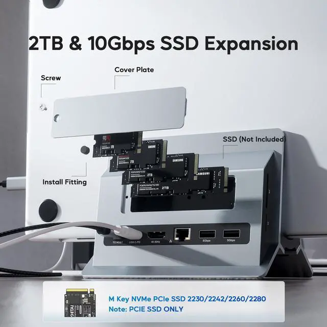2 SSD expansion: Mac Mini Dock supports SSD expansion, you can use this USB Hub to expand the external solid-state hard drive to meet the insufficient storage needs of Mac Mini/Macbook. The USB-C HUB supports M. 2 PCIe NVMe SSD 16Gbps interface, compatible with M. 2 NVMe SSD, 2230/2242/2260/2280 size M. 2 SSD.