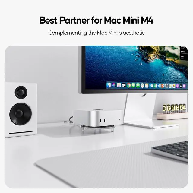 No more fumbling aroundturn your device on/off or restart it in seconds. ^^ Secure & Stable BaseAnti-slip silicone pads keep your Mac Mini M4 Dock Stand firmly anchored, preventing scratches on your desk and reducing vibrations. The elevated design promotes better airflow to prevent overheating. ^^ Enhanced Heat DissipationThe elevated design promotes optimal airflow around your Mac Mini, preventing heat buildup and ensuring efficient cooling during intensive tasks. This Mac Mini M4 Vertical Stand helps maintain peak performance and extends the lifespan of your device.