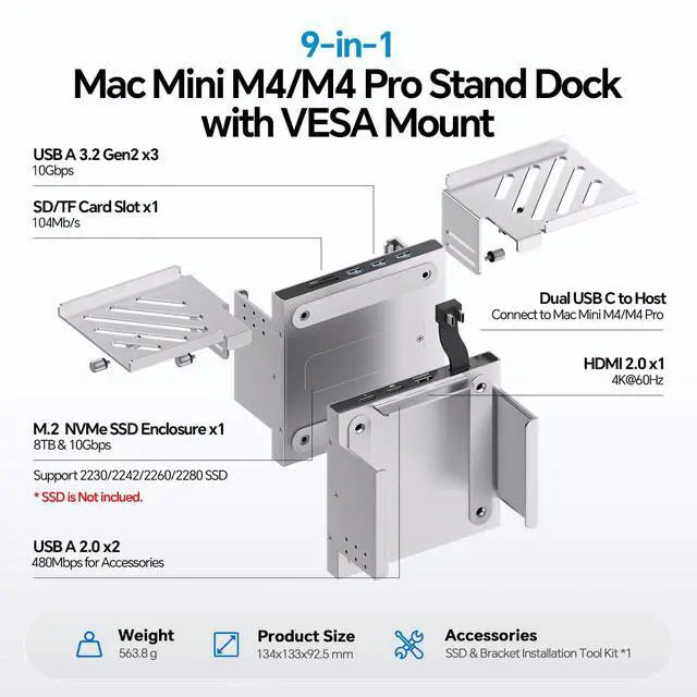 MAC MINI M4 Shelf Dock & MountA dedicated mac mini m4 mount and USB-C hub designed for the Mac Mini M4 (2024), featuring a built-in M. 2 SSD slot supporting up to 8TB of high-speed storage ( SSD not included). This mac mini m4 shelf hub also includes a 4K 60Hz HDMI port, 3*USB-A 3.2 Gen 2 (10Gbps) ports, 2*USB-A 2.0 (Max 480Mbps) ports for keyboard and mouse, SD and MicroSD card readers (104 Mbps). All in one compact, space saving mac mini dock design. Use it as a screen shelf stand dock, a dock bracket on desk partition, an under desk mac mini mount dock, or a mount dock behind monitor (VESA) for a clean, clutter-free workspace.