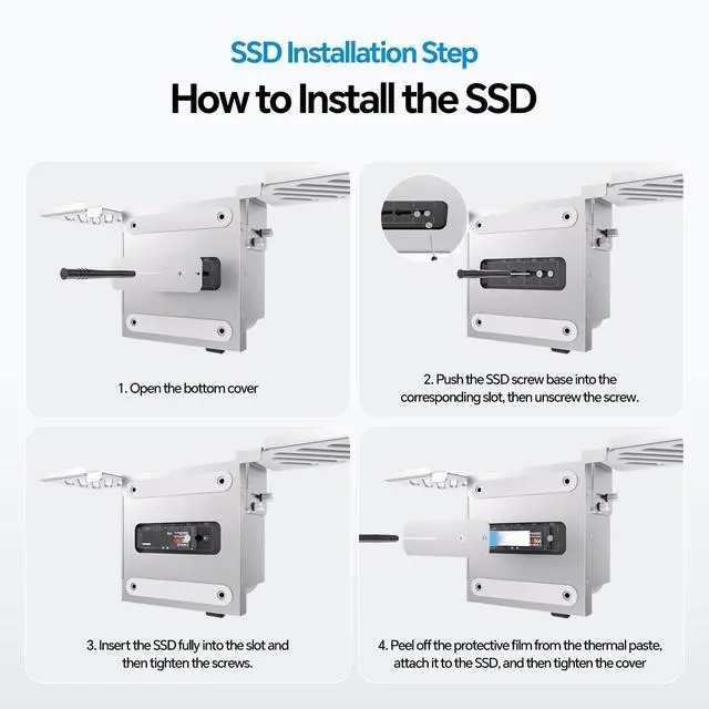 NOTE: The SSD enclosure is on the back of the dock, please install the SSD before installing it to your desired location. ^^ 4K HDMI OutputMac mini M4 Dock equipped with USB-C to Host port (up to 10Gbps) to connect and expend your Mac mini via the HDMI output up to 4K@60Hz, you can be easy and convenient to mirror or extend your mac mini m4 to HDTV, monitor or projector to enjoy vivid video synchronization. Use both HDM