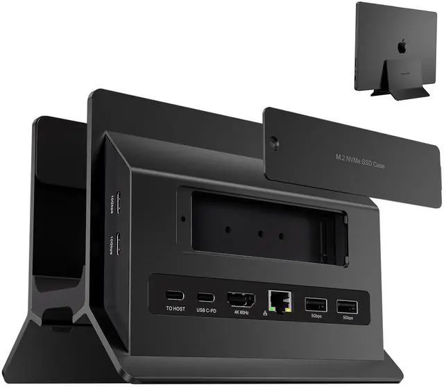 Clamshell Mode: I. Pre-set your Macbook not to auto sleep; II. Connect a mouse to dock to wake up Macbook anytime; III. Connect a PD power adapter of 65w or above to the "PD IN" port ^^ BOTH DOCKING STATION & STAND FOR MACBOOK - Not only meet the needs of memory expansion and comprehensive connectivity, this macbook docking station stand with SSD enclosure also can be used as a laptop stand, allowing you to place your laptop horizontally or vertically on the desk, space-saving and keep your work desk tidy. Compatible with Macbook M1/M2/M3/M4, Macbook Pro M5 2025, MacBook Air, Mac Mini, MacBook Pro, laptops with USB-C port that supports functions of data transmission, video and charging.