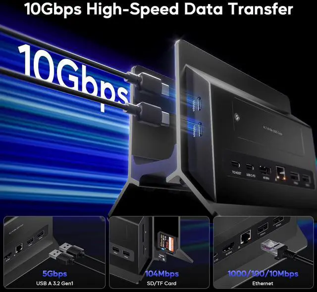 11 IN 1 MacBook DOCKING STATION - PULWTOP macbook docking station is designed with a 4K@60Hz HDMI, 2 x USB A 3.0 5Gbps, 2 x USB C 3.2 10Gbps, 10Gbps/2TB M. 2 NVMe SSD expansion slot, USB C to host, USB C PD in 100W Charge port, SD/ TF card reader, RJ45 Ethernet port (10/100/1000Mbps).
