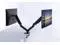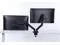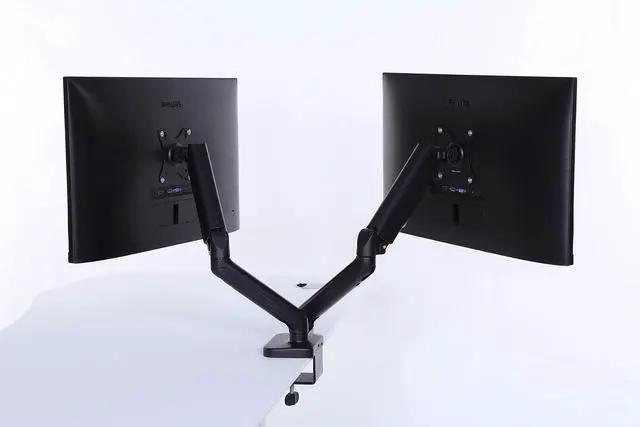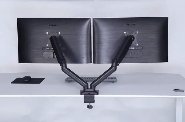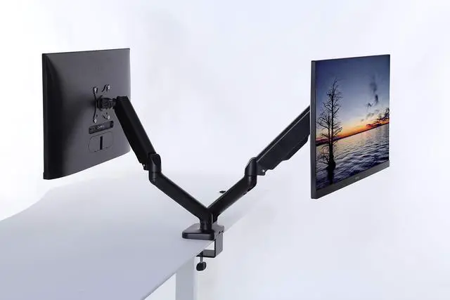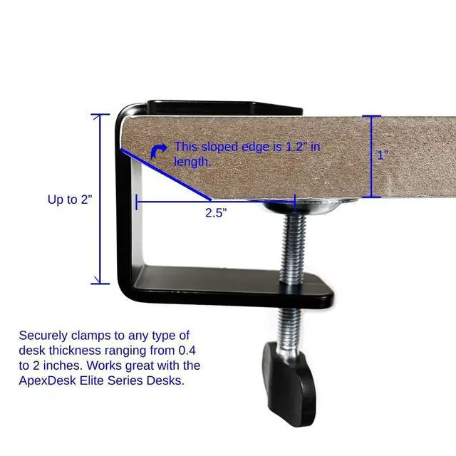 The dual monitor arms fit flat/curved screens 17 to 32 with load up to 20 lbs. on each arm. It supports both VESA 75x75mm and 100x100mm mounting holes. ^^ It works on any work surface that is 0.4 to 2 thick. The C-clamp is 2.5 deep. It works well with desk that has beveled edge. Please refer to the fifth profile picture that shows how it clamps onto the popular Elite Series desk by ApexDesk. The C-clamp has rubber padding and provides a tighter grip without leaving marking on the desktop. ^^ & This monitor arm supports 360 full rotation for landscape or portrait orientation.