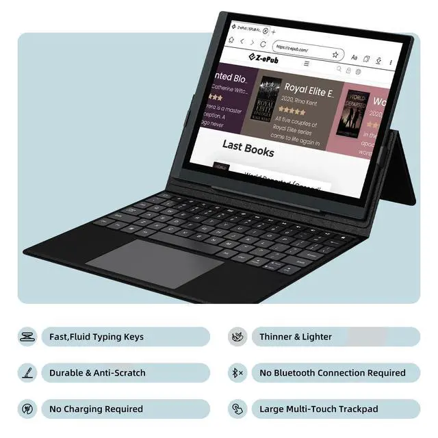 Enlarged keycaps and trackpad: New keycaps are enlarged for smoother keyboard tapping. Provides a more comfortable experience by enlarging the touch area. The keyboard has a lot of shortcut keys to control the B1051 series E-ink reader, you can adjust the sound level, screen brightness,