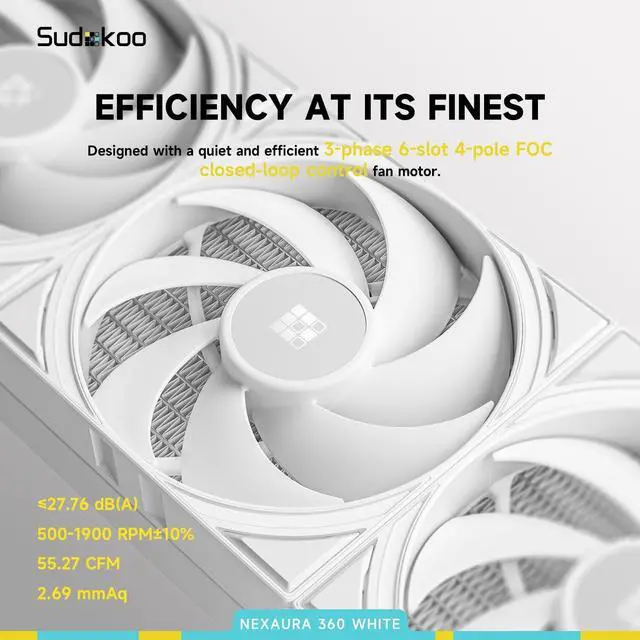 The pump offers an adjustable speed range of 2, 500 to 3, 600 RPM with silenced acoustics and groundbreaking efficiency, effortlessly pushing the TDP to 300W! ^^ NEXAURA 360 is equipped with three high-performing black PWM fans made from PBT material, delivering exceptional pressure and airflow. The fan motor features a 3-phase 6-slot 4-pole FOC closed-loop control design ensuring smoother operation and superior performance. Fan speed is 500-1900 RPM10%, 0 RPM<5% PWM with ISST (Intelligent Start Stop Tech) included. ^^ NEXAURA 360 showcases a full-coverage ARGB diamond glow light effect on the pump cap.