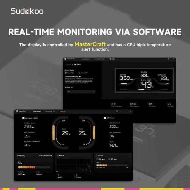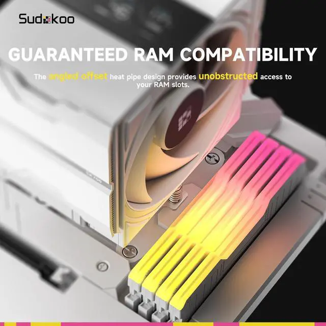 Critical Note: This AM5 air cooler is mechanically incompatible with the MSI MAG B850M Mortar (WIFI) motherboard. ^^ EFFORTLESS INSTALLATIONTool-Free Slide-In Mounting allows easy fan removal and maintenance, securing AM5 socket cooler setup in seconds. ^^ REAL-TIME DIGITAL DISPLAYEquipped with a digital display, this air CPU cooler AM5 shows real-time CPU metrics like temperature (C/), load, and frequency. This digital CPU cooler for AM5 is controlled via Sudokoo Control Center MasterCraft (Win10/11 ONLY). Perfect for gamers and overclockers who demand real-time monitoring in a single tower air cooler. ^^ Quiet AMD AM5 COOLERSK700V WHITE AM5 air cooler is equipped with a 120mm FDB PWM fan. With adjustable speeds from 500~2200 RPM10%, and 0 RPM under 5% PWM load, its the ideal balance of cooling and silence. ^^ AM5 CPU ANTI-BEND PROTECTIONThe Sudokoo SK700V WHITE CPU air cooler is designed exclusively for AM5 sockets, featuring an anti-bend bracket to protect your CPU while ensuring secure mounting for optimal cooling performance. Please install it on CPU when motherboard is placed horizontally, not vertically. ^^ FULL RAM CLEARANCEEquipped with an offset design, this air CPU cooler provides full RAM freedom, allowing unobstructed access to memory modules for seamless PC building and upgrades.