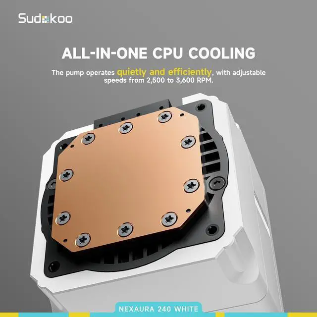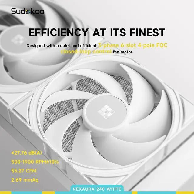 The pump offers an adjustable speed range of 2, 500 to 3, 600 RPM with silenced acoustics and groundbreaking efficiency, effortlessly pushing the TDP to 280W! ^^ NEXAURA 240 WHITE is equipped with two high-performing white PWM fans made from PBT material, delivering exceptional pressure and airflow. The fan motor features a 3-phase 6-slot 4-pole FOC closed-loop control design ensuring smoother operation and superior performance compared to standard fans. Fan speed is 500-1900 RPM10%, 0 RPM<5% PWM with ISST (Intelligent Start Stop Tech) included. ^^ Easily control and synchronize your cooler's ARGB lighting effects through compatible motherboards and controllers for full customization.