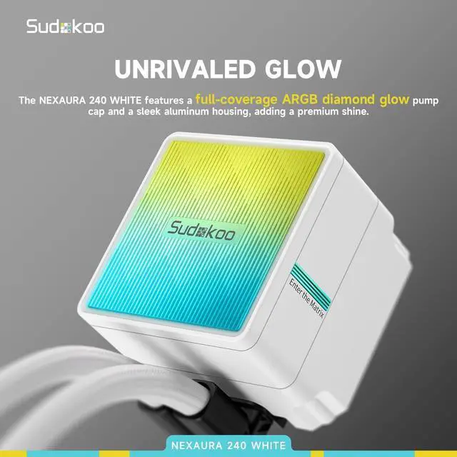 ^^ NEXAURA 240 WHITE showcases a full-coverage ARGB diamond glow light effect on the pump cap. The sleek aluminum housing adds a premium finishing touch and a polished shine.