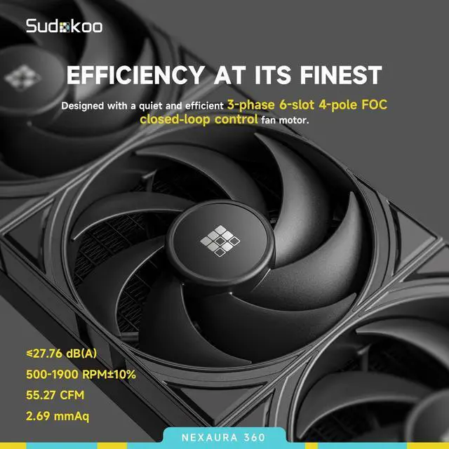 PWM pump offers an adjustable speed range of 2, 500 to 3, 600 RPM, featuring a quiet design and breakthrough efficiency. With its powerful performance, it effortlessly boosts TDP to 300W! ^^ NEXAURA 360 is equipped with three high-performing black PWM fans made from PBT material, delivering exceptional pressure and airflow. The fan motor features a 3-phase 6-slot 4-pole FOC closed-loop control design ensuring smoother operation and superior performance. Fan speed is 500-1900 RPM10%, 0 RPM<5% PWM with ISST (Intelligent Start Stop Tech) included. ^^ NEXAURA 360 showcases a full-coverage ARGB diamond glow light effect on the pump cap.