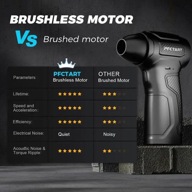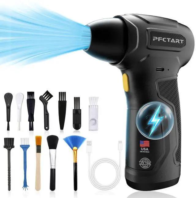 Upgraded Powerful Motor: PFCTART compressed air duster features a high-efficiency brushless motor that reaches speeds of up to 200, 000 RPM, delivering 200 G of blowing force. It easily clears dirt and debris from keyboards and other electronics, making it perfect for home, office, or car cleaning ^^ Alternative to