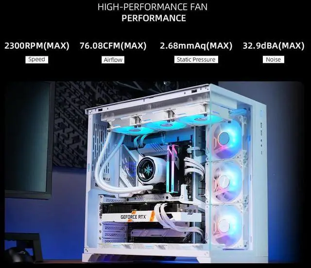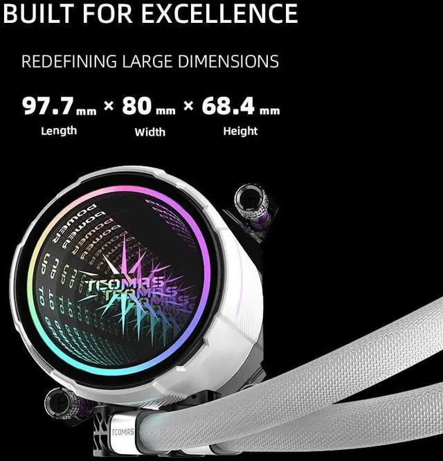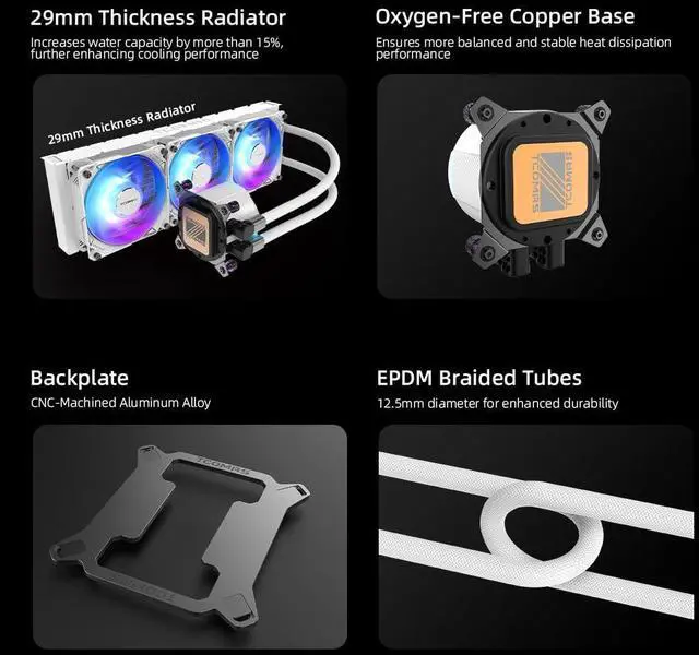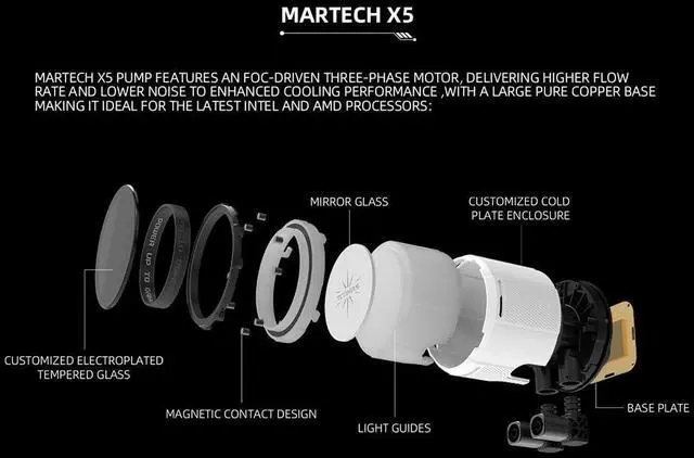 The Martech X5 water pump features an FOc-driven three-phase motor, delivering 30% increased water flow and rotation speed This improvement enhances effective heat dissipation and reduces noise levels. 29mm Thickness Radiator Enhanced with over 15% additional coolant capacity to further augment cooling capabilities. Oxygen-Free Copper Base Ensures more balanced and stable thermal performance Backplate Aluminum Alloy CNC Material EPDM Braided Tubing Diameter 12.5MM, enhanced durability Fan Lighting Effects - Beginner Gameplay Motherboard light synchronization, rainbow lighting effects, monochrome lighting