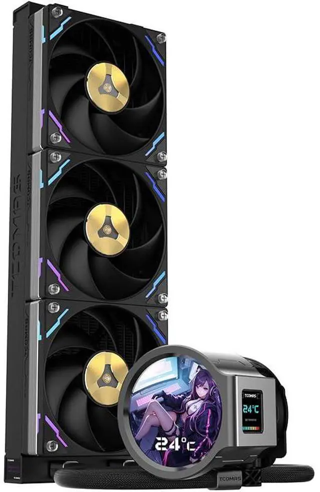 1 x CPU Water Block with magnetic front panel 1 x CPU Liquid Cooler (pre-applied thermal paste) 3 x 120mm Radiator Fans 1 x ARGB 2.0 Input Cable 1 x 3-Way Fan Splitter Cable 1 x Accessory Pack with Screws and Brackets 1 x TCOMAS Fragrance Card