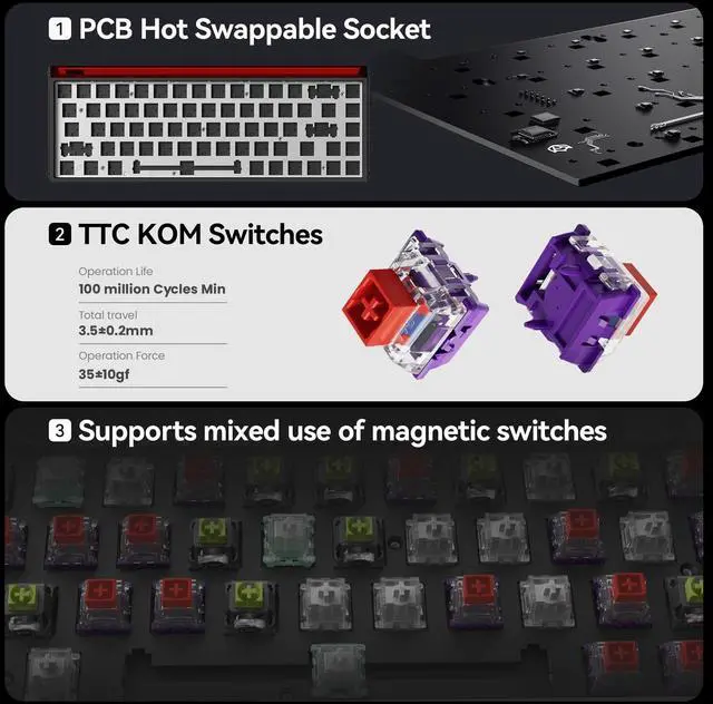^^ Pro-Grade Performance: 16K polling rate and 8KHz report rate ensure zero-lag inputs, outperforming human reaction limits. W. I. N. Algorithm and Rapid Trigger dynamically optimize actuation points for error-free AD strafing in titles like Valorant. ^^ Unmatched Customization Hot-swappable switches and hybrid switches compatibility let users mix brands. Replaceable RGB lightbox panels and side plates enhance visual personalization. ^^
