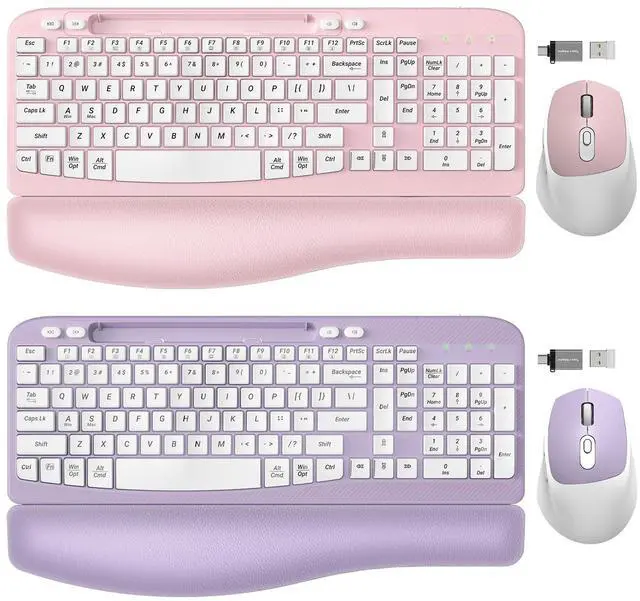 2 Pack Wireless Keyboard and Mouse Combo, EAYBLLY Wave Keys Wireless Ergonomic Keyboard with Cushioned Wrist Rest, Phone Holder, 2.4GH z Silent Cordless Keyboard Mouse Set