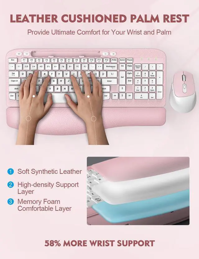 [(ERGONOMIC CUSHIONED PALM REST)] : Distinguished from conventional keyboards, this keyboard includes a curved palm rest with a soft memory foam layer, designed with a soft and resilient leather surface, reducing wrist bending throughout the day