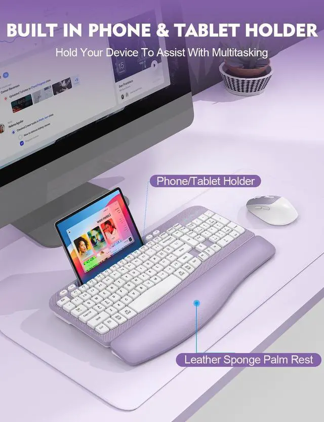 [(WAVE-SHAPED KEYS DESIGN)] : The wireless keyboard features ergonomic design with wave-shaped keys layout that arches in the center, let your hands in a more natural posture, offering a unique typing experience that promotes comfort and efficiency
