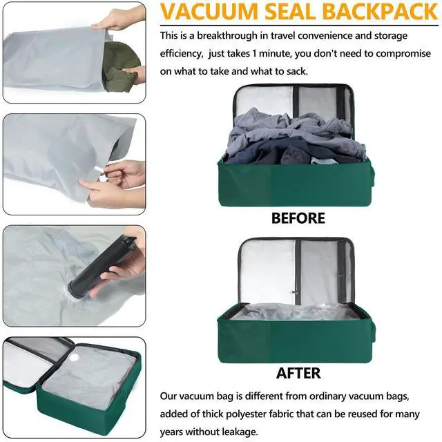 VACUUM BACKPACK: This travel backpack comes with a durable vacuum storage bag. This is a breakthrough in travel convenience and storage efficiency, fit the maximum capacity in a compact form, allow you to pack up to 50-60 liters of clothing, much more than 20-inch carry-on suitcase. Just takes 1 minute, experience the future of travel that redefines what it means to travel light and efficiently, you don't need to compromise on what to take and what to sack. Including travel hand pump.