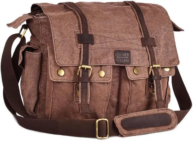 LEATHER VILLAGE Vintage Canvas Messenger Bag - 16 Inch Handmade Laptop Shoulder Bag for Men & Women - Crossbody Work Bag for Office, Travel & Daily Use - Brown