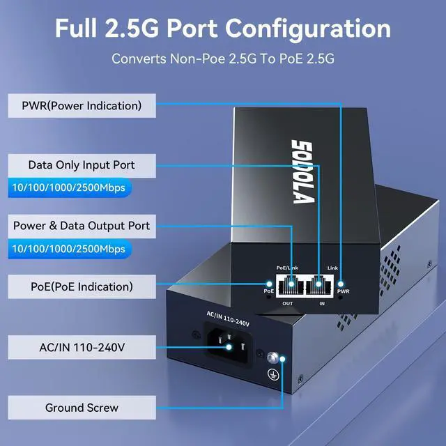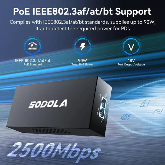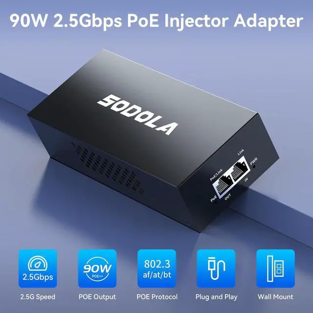 SODOLA 2.5G PoE++ Injector 90W,IEEE802.3at/af/bt Compliant,Power Over Ethernet Distances Up to 328ft, Metal Casing,Wall-Mount Supported 2.5Gb Injector Adapter
