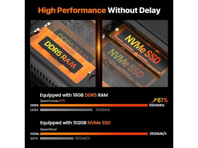- 16GB DDR5 RAM & 512GB NVMe SSDInstalled with DDR5 32GB RAM, the WO7 mini pc support expansion to 64GB RAM. Featured with 1TB NVMe SSD, up to 4TB. (Upgrades not included)