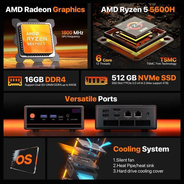 The Ryzen 5 5600H CPUThe WO4 Mini PC is a Small Desktop Micro Mini Computer with an Ryzen 5 5600H (6C/12T up to 4.2G hz) processor. The GPU is integrated with a powerful Radeon Graphics Card; This mini computer can handle heavy computing tasks smoothly and better for multitasking. ^^ Triple-display & 4K/60Hz UHD Video OutputThis small pc has Radeon Graphics that frequency is supports 4K 60Hz triple screen display. It can support up to three 4K displays via HD port, Type-C, without any limitation on the combination used. Easy to enjoy Web surfing, or connect to your projector as a home theatre, enjoy a variety of entertainment.