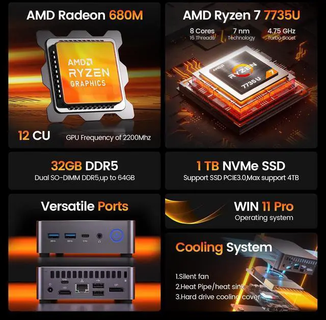 The Ryzen 7 7735U CPUThe WO7 Mini PC is a Small Desktop Micro Mini Computer with an Ryzen 7 7735U (8C/16T up to 4.75G hz) processor. The GPU is integrated with a powerful Radeon 680M 12 CU Graphics Card; This mini computer can handle heavy computing tasks smoothly and better for multitasking. ^^ 32GB DDR5 RAM & 1TB NVMe SSDInstalled with DDR5 32GB RAM, the WO7 mini pc support expansion to 64GB RAM. Featured with 1TB NVMe SSD, up to 4TB. (Upgrades not included) ^^ Quadruple-display & 4K/60Hz Video OutputThis small pc has Radeon 680M Graphics that frequency is supports 4K 60Hz quadruple screen display.