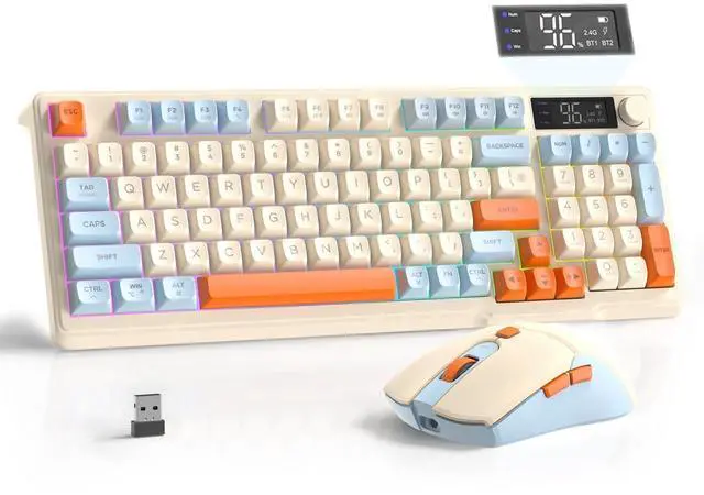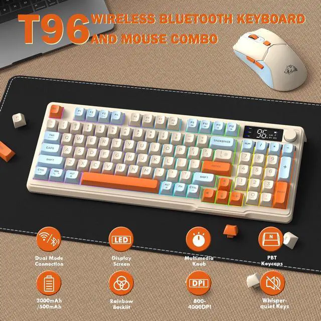 Wireless Gaming Keyboard and Mouse ComboThis premium all-in-one gaming set is designed for gamers, featuring the T96 LED-backlit keyboard and T96 gaming mouse for smooth, stable performance. T96 membrane keyboard delivers swift, responsive keystrokes with a comfortable, ultra-quiet typing experience. The T96 silent-click mouse boasts an ergonomic design, precise tracking, and a comfortable grip. Whether for late-night gaming or office work, this combo ensures both rapid response and noise-free operation. ^^ Smart Display & Multimedia Control KnobThe wireless gaming keyboard features an intelligent LED display that shows real-time battery status, connection mode, and charging progress.