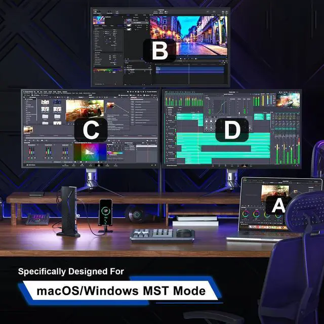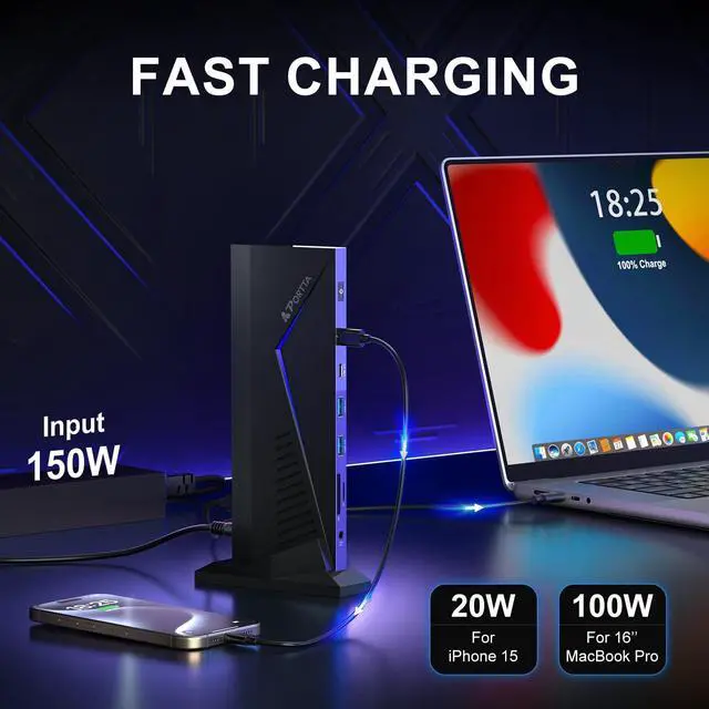 ^^ 100W PD & 20W PD Fast ChargingEquipped with a 150W, 20V, 7.5A power adapter, allows you to charge your laptop with up to 100W. Additionally, the USB-C 3.0 PD port offers 20W of charging power for connected devices such as smartphones, enhancing the versatility of this USB C dock. ^^ Broad CompatibilityThe Silicon Motion dock is compatible with USB-C, USB-A, Thunderbolt 3/4, and USB 4 standard ports. Support SST/MST for Windows 7/8/ 8.1 /10 and above or M1 / M2 / M3 / M4 MacOS 10.10. x and above.