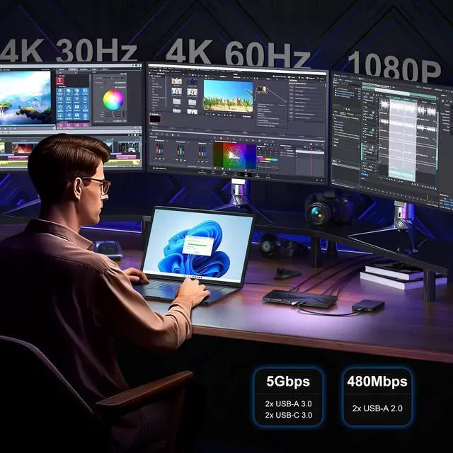 14 IN 1 Docking StationThis USB-C Dock with HDMI 4K 60Hz x1, 4K 30Hz x1, 1080p 60Hz x1, USB-A 2.0 480Mbps x2, USB-A 3.0 5Gbps x2, USB-C 3.0 5Gbps (Data Only), USB-C 3.0 5Gbps with 20W PD Charging, 1Gbps Ethernet, SD/TF (104 MB/s), 100W PD Charging and a 3.5 mm 4-Pole TRRS Headphone Jack. It enables laptops to be easily connected to various external devices and achieve Full-Speed data transfer. ^^ Triple Displays This PORTTA Docking Station supports triple monitors. HDMI 1 1080P 60Hz, HDMI 2 4K 30Hz (Install Silicon Motion Driver Required), and HDMI 3 4K 60Hz Plug and Play (DP Alt Mode Required).