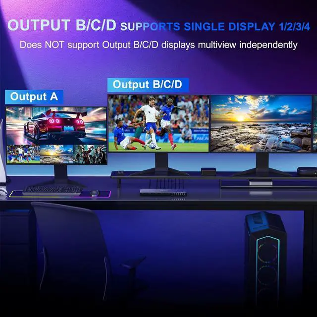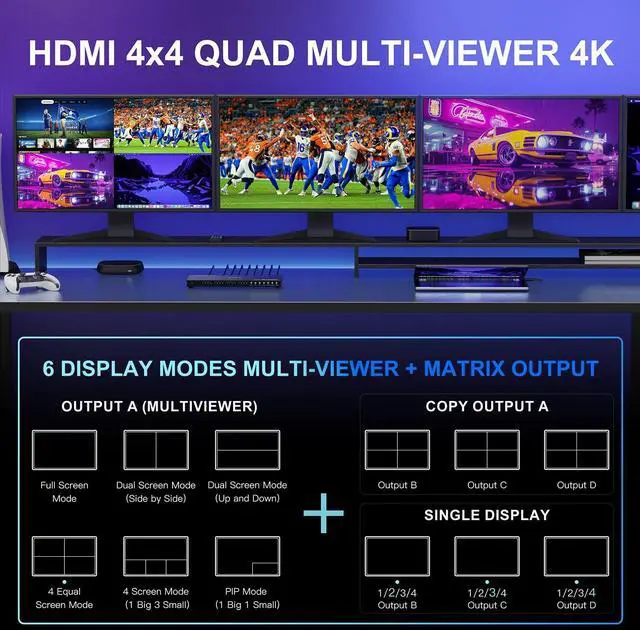 6 Viewing Modes This 4K HDMI multiviewer switch 4x4 allows you to connect up to 4 high-definition sources to 4 HDMI display terminals. Output A offers a Multiview function, providing