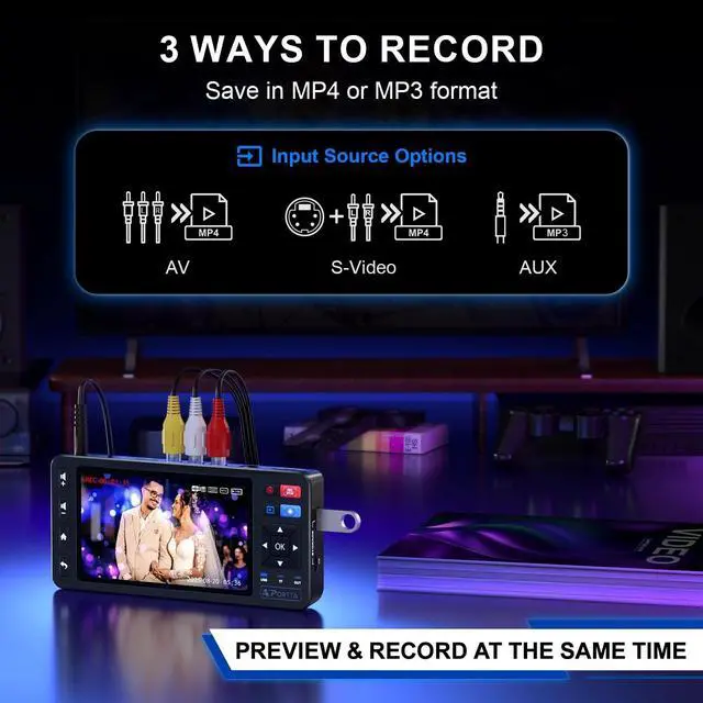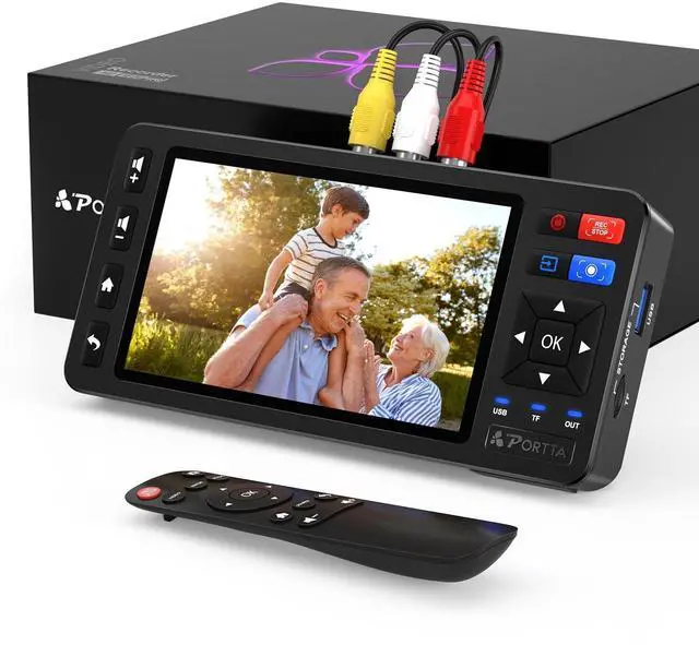 Simple VHS to Digital ConversionEasily convert your old VHS, Hi8, Mini DV, DVD, or camcorder footage into MP4 filesConnect, record, and preserve your memories in Full HD 1080p at 60fps. ^^ 5-Inch HD LCD Preview ScreenBuilt-in 5" high-definition screen for real-time preview and playbackSee what youre recording instantly and ensure every moment is captured perfectly. ^^ Customizable Image SettingsAdjust brightness, contrast, and saturation directly from the screen for the best image quality. Fine-tune colors and lighting to make every frame vivid and clear. ^^ Flexible Storage OptionsSave your videos directly to USB flash drives, TF cards, portable HDDs, and SSDs.