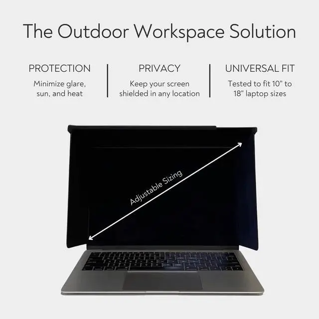 Sun Shield ^^ Eliminate laptop screen glare and improve screen visibility. ^^ Heat Shield ^^ Protect from sun heat to reduce laptop temperature, improve laptop performance and extend battery life. ^^ Privacy Shield ^^ Block the vision of strangers to keep laptop screens confidential. ^^ Ultra Portable ^^ Lightweight and easy to take anywhere by folding it up and packing in backpacks, bags and sleeves. ^^ Durable Build ^^ Designed with impact resistant materials and remains sturdy on laptops through bumps and breezes. ^^ Laptop Safe ^^ Soft-touch foam contact to keep laptops safe.