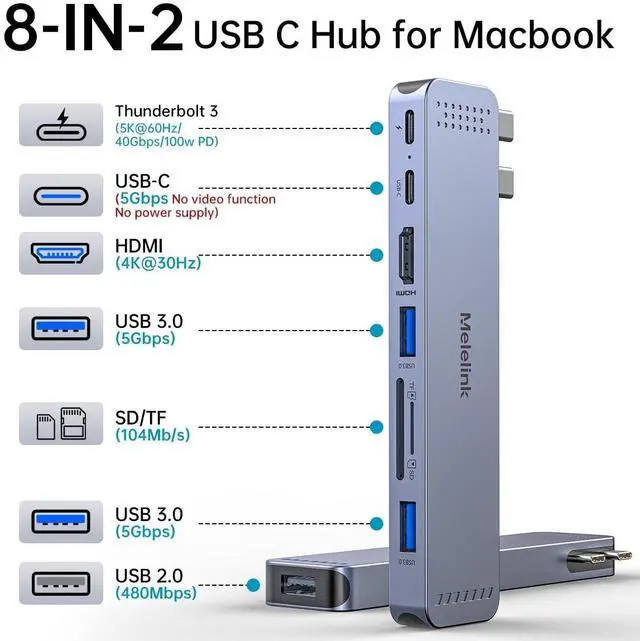 Macbook USB-C Adapter 8 IN 2 This MacBook Air USB adapter is specially designed for 13''-16'' MacBook Pro (2016-2024) and MacBook Air (2018-2025). Expand your MacBook into 1 HDMI port(4K@30Hz), Thunderbolt 3 port, 2*USB 3.0 ports/USB-C port/USB 2.0, SD Micro and SD card readers.