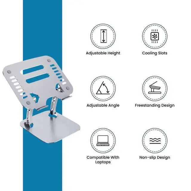 Height adjustable from 1.5" to 5" ^^ Cooling slots to help keep laptop ventilated ^^ Adjustable angle ^^ WARRANTY - 1 Year Product Warranty + 30 Day Satisfaction Guarantee