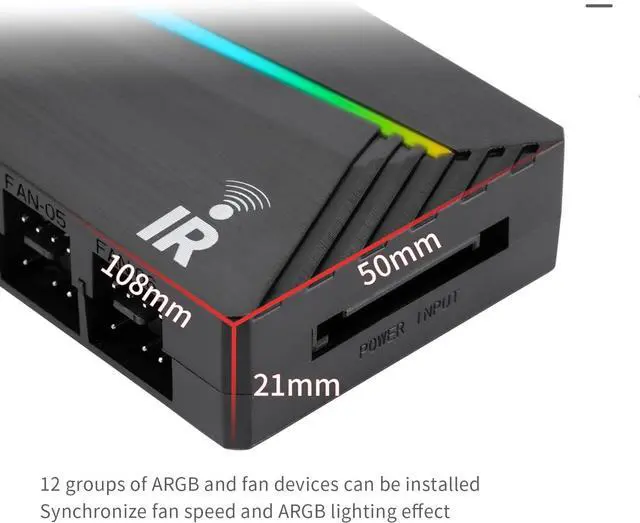 [Specifications] Model: FAN and ARGB HUB X12 IR Black, size: 108x50x21mm, material: plastic, color: black, cable length: 500mm, easy to solve the situation of insufficient ARGB lighting interface and fan power supply interface of the motherboard
